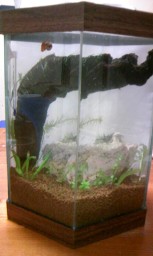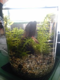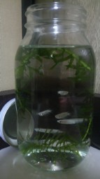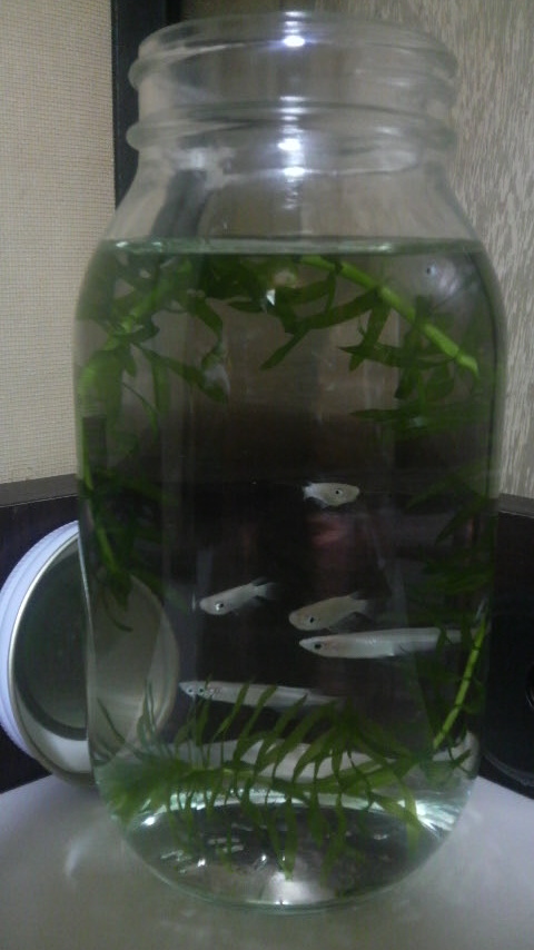 【水量】4L位 【維持期間】今年の5月末に立ち上げ 【蓋】有(穴あいているけど) 【設備】特になし 【置場所】リビングのテーブルの上 【底砂・土】小粒の大磯 【生体】メダカの稚魚5匹位、ヒメタニシの稚貝1匹 【水草】カボンバ、アナカリス、ウィローモス オオサンショウモ 【コメント】睡蓮鉢からとってきたオオサンショウモに 付いていたメダカの卵が孵化したらしい…