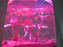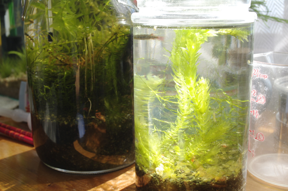 【水量】500ml 【維持期間】2週目 【蓋】有 【設備】自作LEDライト(660nm赤+470nm青) 【置場所】スピーカーの上w 【底砂・土】山土 【生体】なし 【水草】雑草