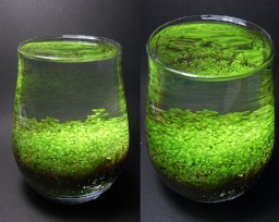 【水量】50ml未満(多分) 【維持期間】~5ヶ月(多分) 【蓋】有(普段は微妙に浮かせてある) 【設備】特に無し 【置場所】テレビの前(若干の太陽光有) 【底砂・土】ソイル 【生体】(おそらく)少量のカイミジンコ 【水草】リシア 【コメント】テストうpしてみた。
