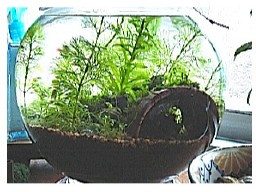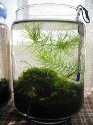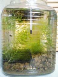 右ボトル 【水量】1L 【維持期間】約11ヶ月(2008/11/22左ボトルより分譲) 【蓋】無(気温15度以下になったら閉めようと思う) 【設備】なし 【置場所】南向きの窓際 【底砂・土】未処理大磯 【生体】アカヒレ×1、サカマキガイ稚貝×数匹、レッドラムズ稚貝×数匹 【水草】アナカリス、ウィローモス、ヒゲ状コケ 【コメント】左ボトルと同じく、追肥した。 アナカリ元気!コケも元気!