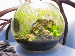 【水量】600mlくらい? 【維持期間】一週間 【蓋】穴あき蓋 【設備】なし 【置場所】日当たりのいい窓際。夜はPC前 【底砂・土】カスタムソイルだった気がする。 【生体】レッドチェリーシュリンプ1 【水草】麦飯石に巻き付けたモス、グロッソ
